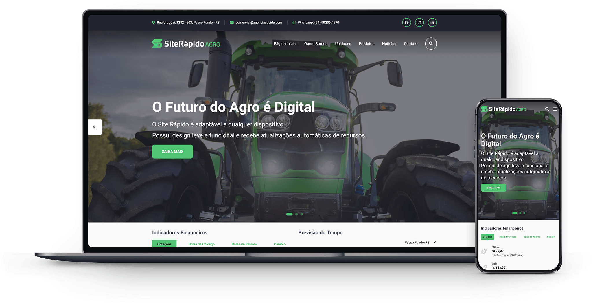Modelo de site já estruturado indicado para marcas do campo e do setor agro como indústrias, produtores de grãos e sementes, cooperativas, cerealistas e entidades agrícolas.