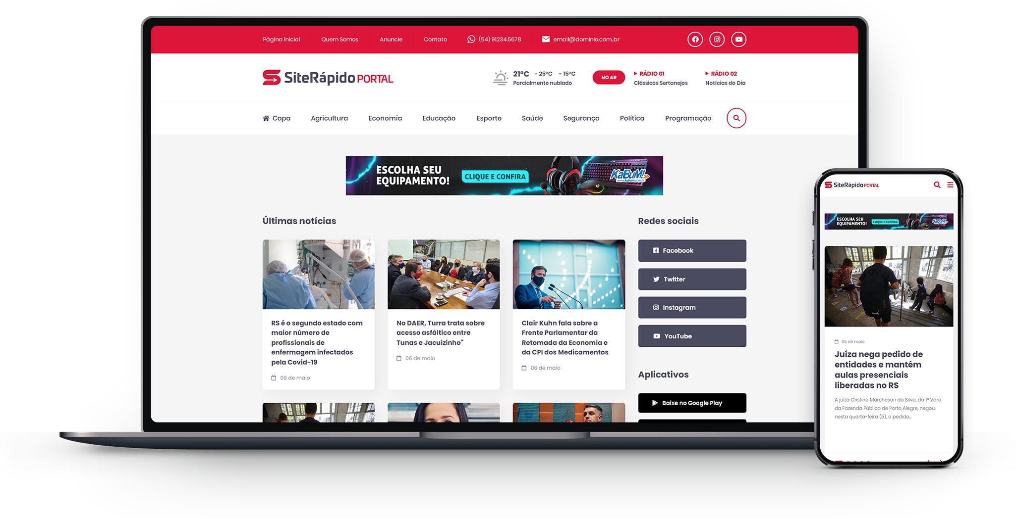 Modelo de site já estruturado indicado para empresas com foco jornalístico e que atuam na criação cotidiana de conteúdo. Recomendado para rádios, portais locais, jornais, revistas.